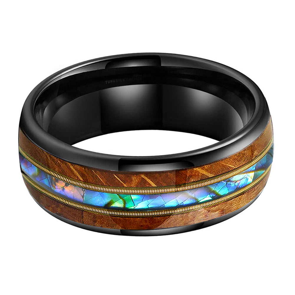 Musical Soul Ring - 8mm Black Tungsten Ring with Guitar Wood Inlay, Dual Strings & Shell Inlay – Men's Wedding Band