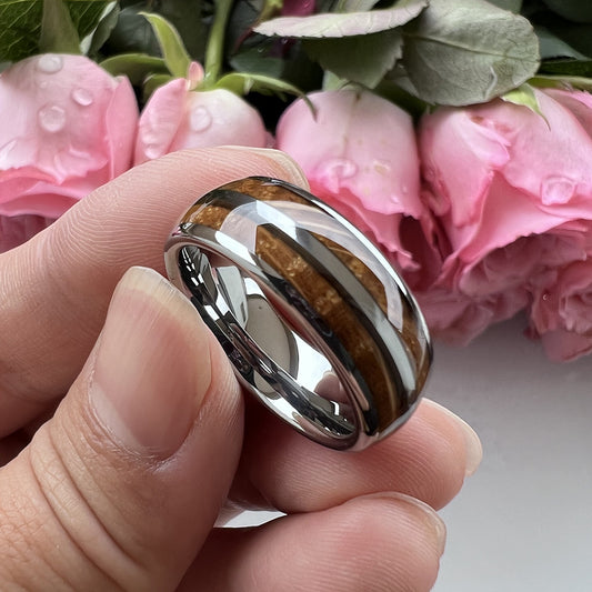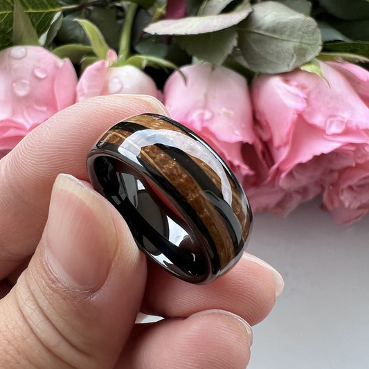 Whiskey Enchantment Ring - 8mm Black Tungsten Ring with Dual Whiskey Barrel Wood Inlay – Men's Wedding Band
