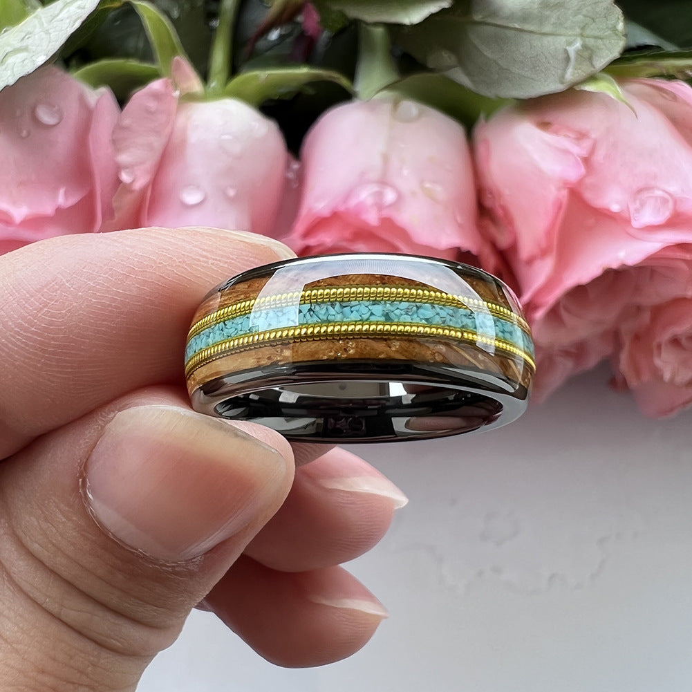 - Premium Materials: Constructed from black-plated tungsten carbide, this ring is incredibly durable, scratch-resistant, and designed to maintain its bold look over time. The inlay of genuine guitar wood adds a warm, organic touch, while dual guitar strings pay tribute to music lovers. The turquoise stone provides a vibrant pop of color.